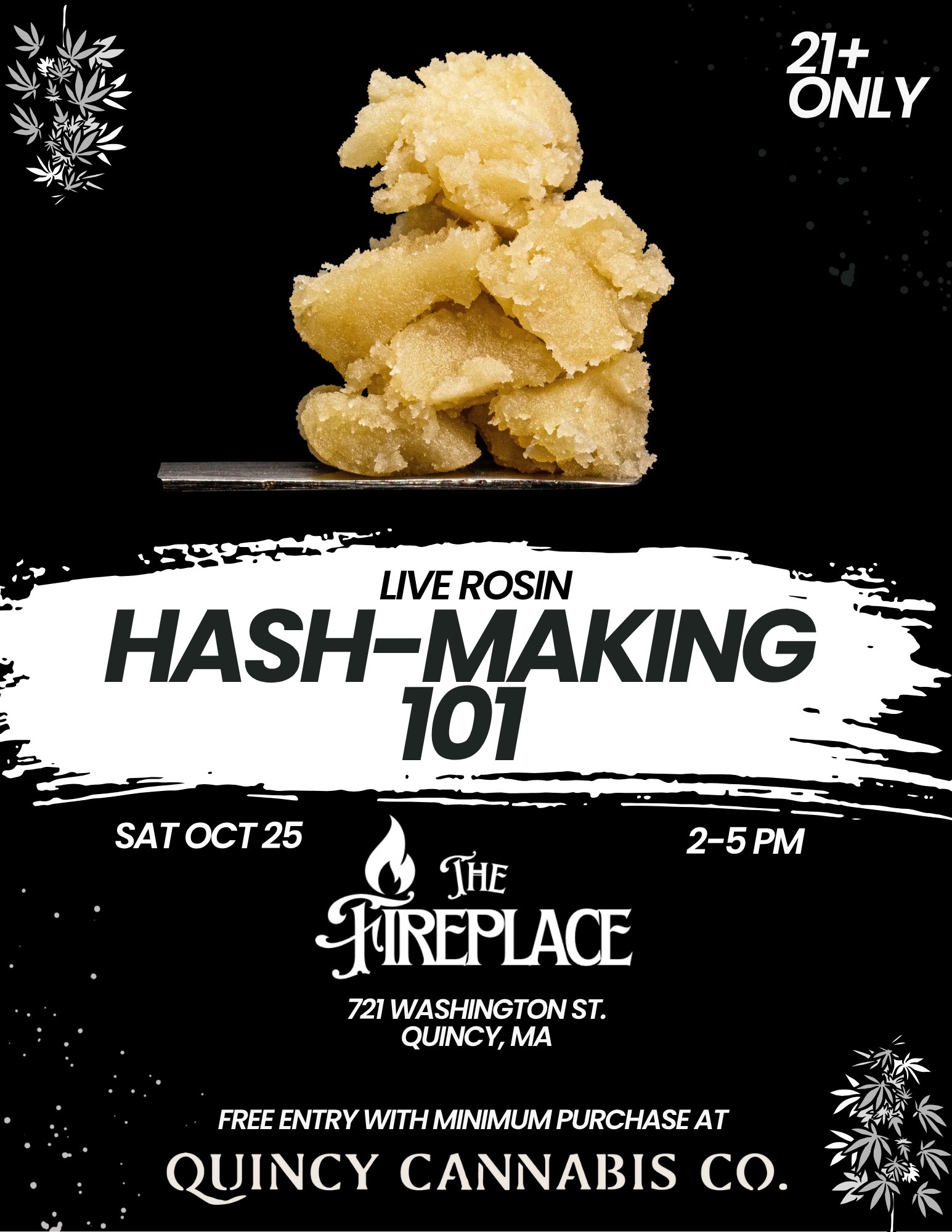 The Fire Place Route 3A 723 Washington St, QuincyJoin us for a FREE (with minimum purchase at QCC) hash-making 101 class at The Fire Place at 721 Washington St. in Quincy, MA, 02169. Here you will learn what it takes to turn the familiar green bud into a golden, highly-potent concentrate!